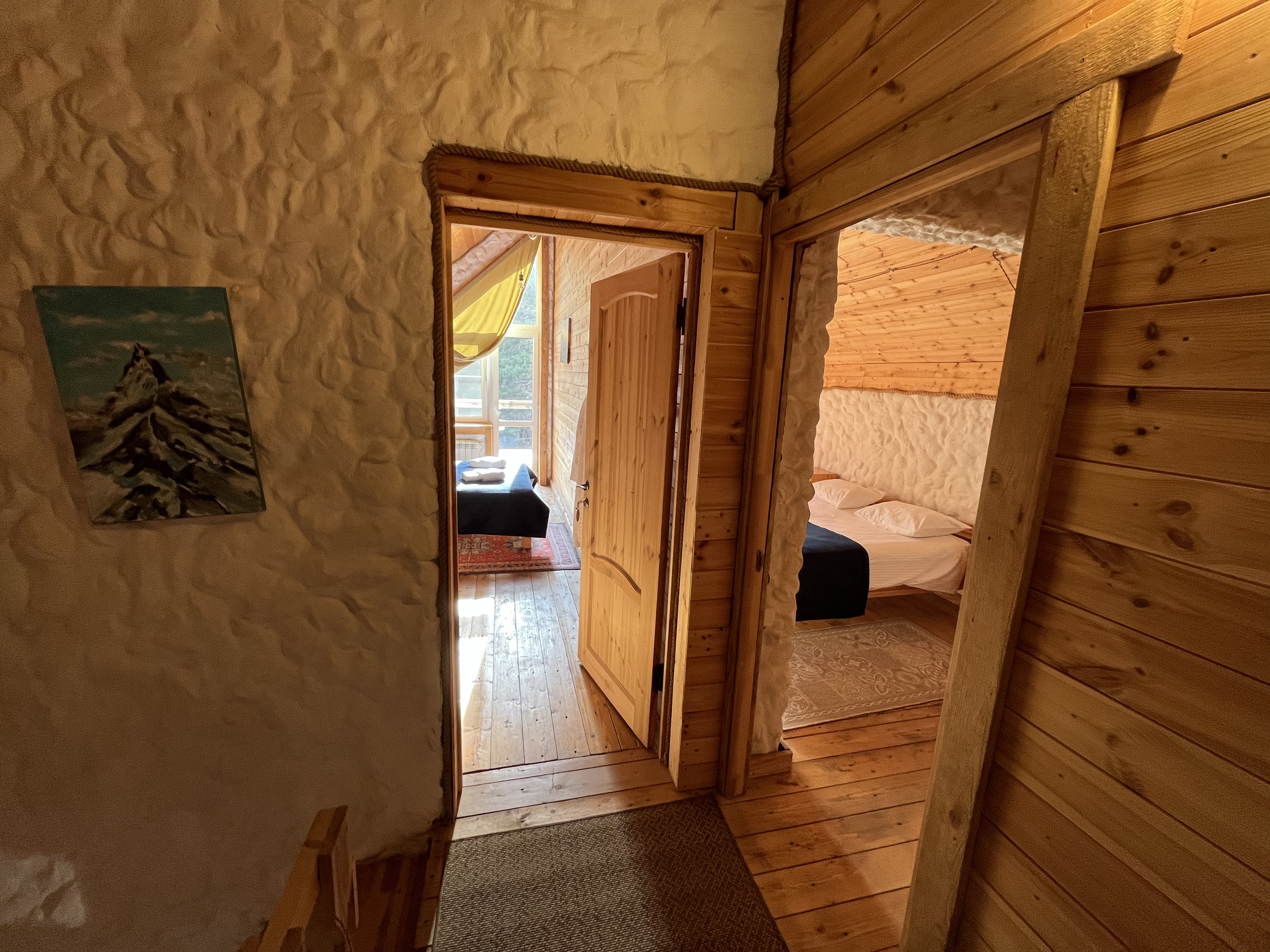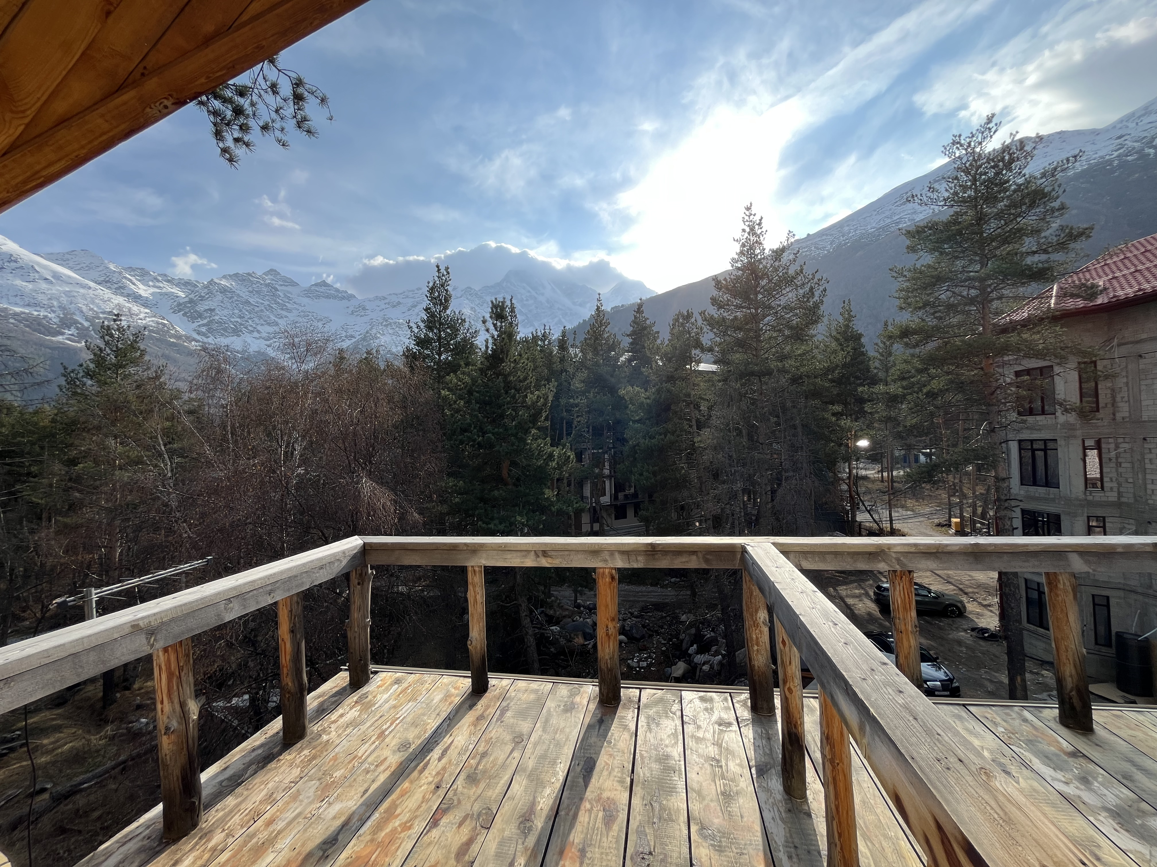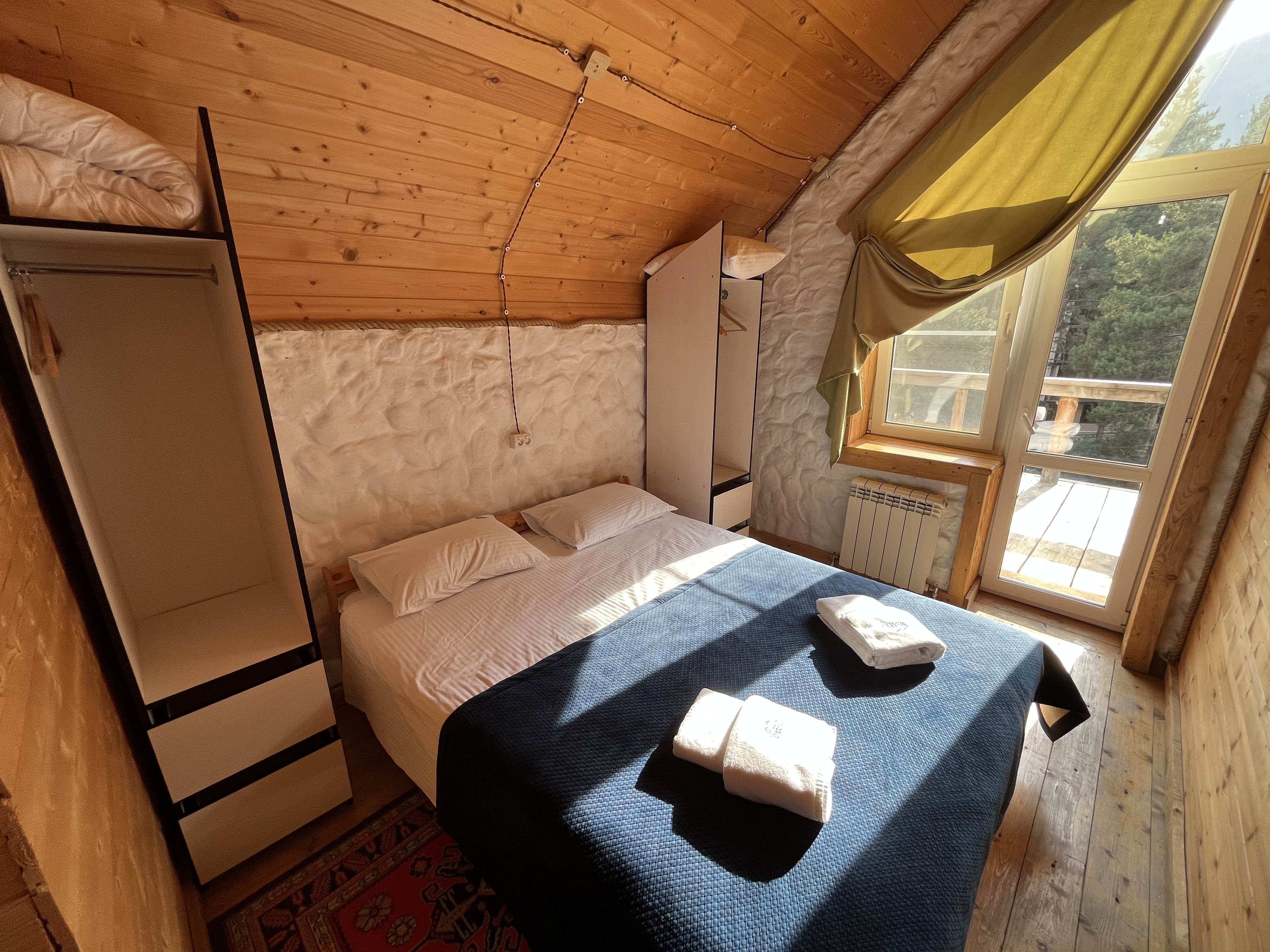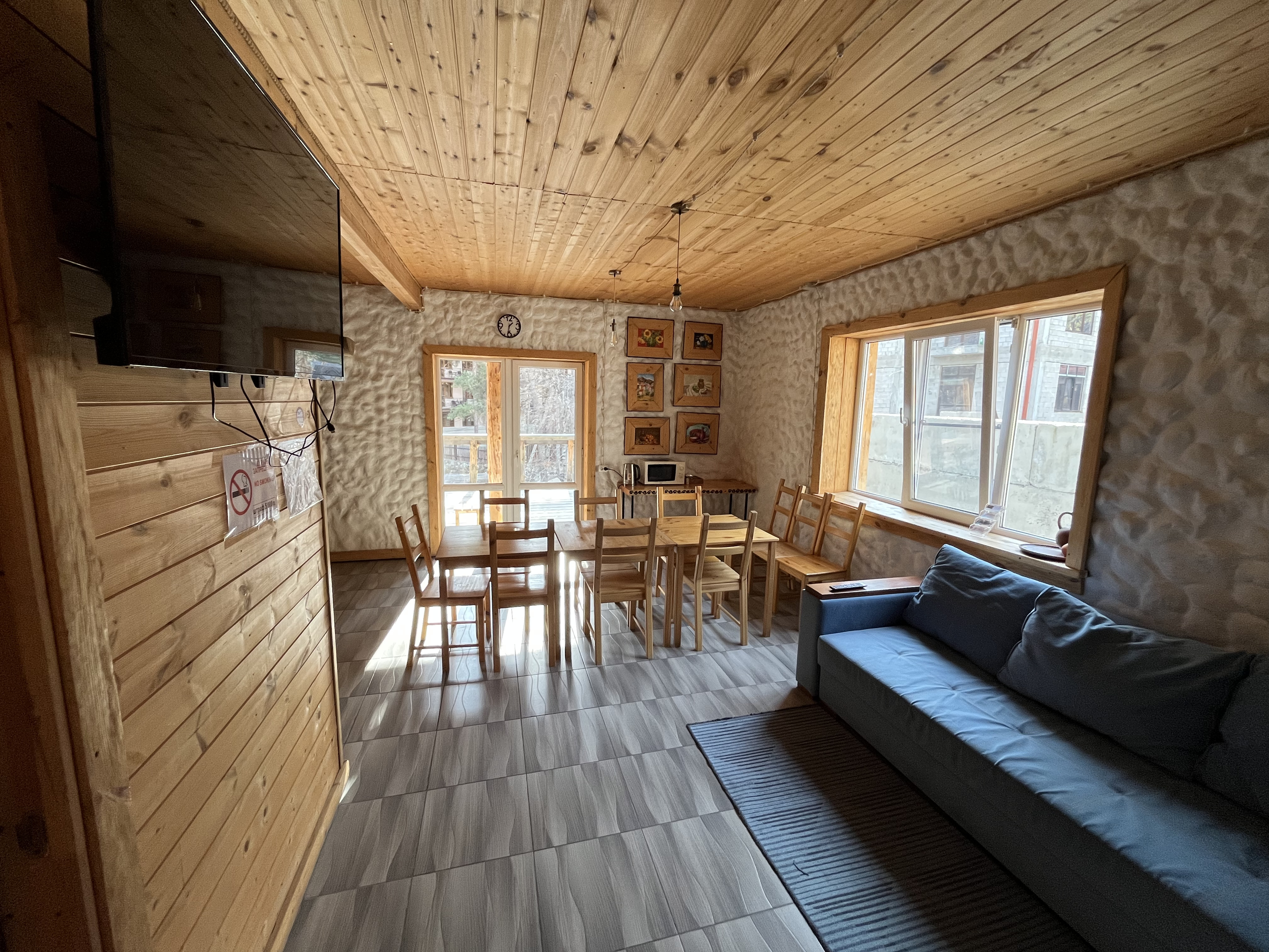 Мы предлагаем вашему внимаю просторный дом на большое количество гостей, где с комфортом разместятся от 1 до 10 человек. Домик оснащен собственным санузлом с душем, а также оборудованной комнатой отдыха. Отдохните на веранде с чашкой горячего напитка и полюбуйтесь захватывающими видами на величественные горы.